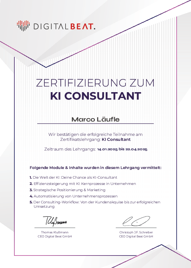 Mein Praxisansatz und meine Leidenschaft für zukunftsorientierte Projekte machen mich zu einem zuverlässigen Partner – besonders, wenn es darum geht, Künstliche Intelligenz mit ins Spiel zu bringen. Denn eines habe ich gelernt: Erfolg braucht Erfahrung, Technologie und eine klare Vision. Mit dieser Mischung helfe ich Unternehmen dabei, neue Potenziale zu entdecken, Abläufe schlanker zu gestalten und langfristig erfolgreich zu bleiben.